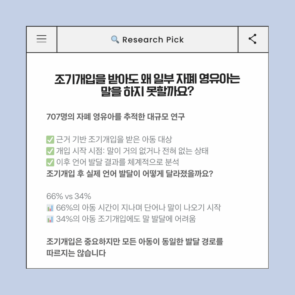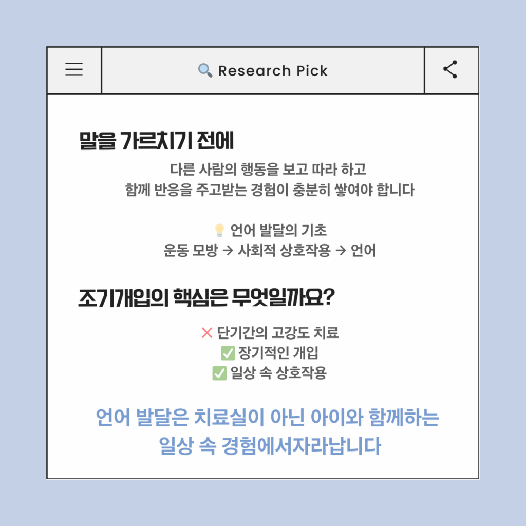 이 연구는 조기개입의 방향에 대해 중요한 메시지를 전합니다. 언어 발달은 치료실 안에서만 만들어지는 것이 아니라, 아이의 발달 특성에 맞춘 장기적인 개입과 일상 속 상호작용을 통해 자라난다는 점입니다. 조기개입은 단기간의 고강도 치료보다, 부모와 양육자가 아이와 함께하는 일상 속 경험을 어떻게 만들어 가는지가 핵심임을 이 연구는 강조하고 있습니다.