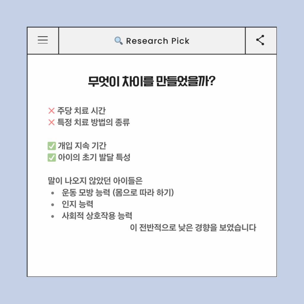 연구진은 이러한 차이가 왜 발생하는지를 분석한 결과, 주당 치료 시간이나 특정 치료 방법의 종류는 언어 발달 결과와 큰 관련이 없었다고 보고했습니다. 대신, 개입이 얼마나 오래 지속되었는지(지속 기간)와 아이의 초기 발달 특성이 더 중요한 영향을 미쳤습니다. 특히 말이 나오지 않았던 아이들은 운동 모방 능력(몸으로 따라 하기), 인지 능력, 사회적 상호작용 능력이 전반적으로 낮은 경향을 보였습니다. 이는 말을 가르치기 전에, 다른 사람의 행동을 보고 따라 하고 함께 반응을 주고받는 경험이 충분히 쌓여야 함을 시사합니다.
